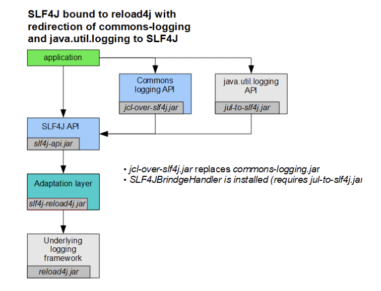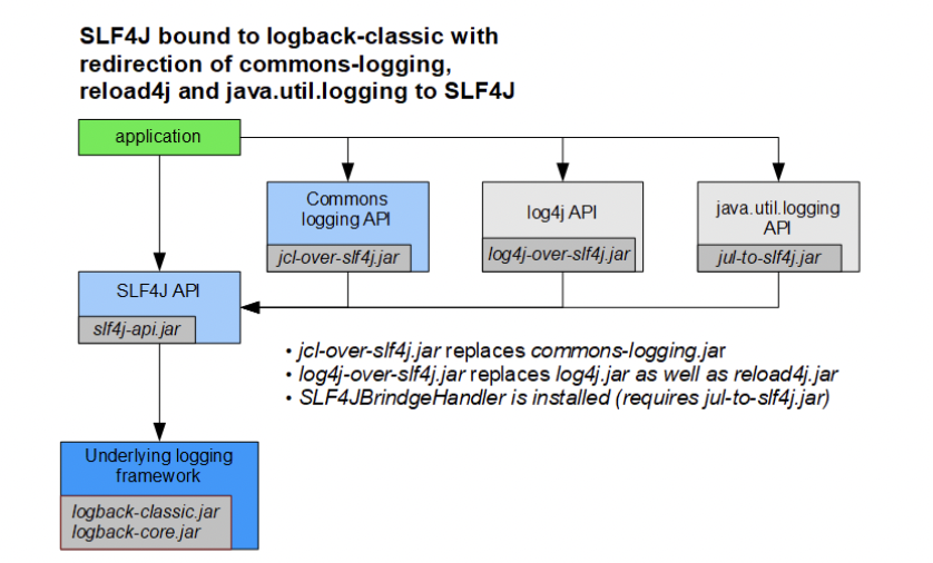마찬가지로 jcl-over-slf4j.jar가 Commons logging API를 대체하며 java.util.logging API도 동일하다.