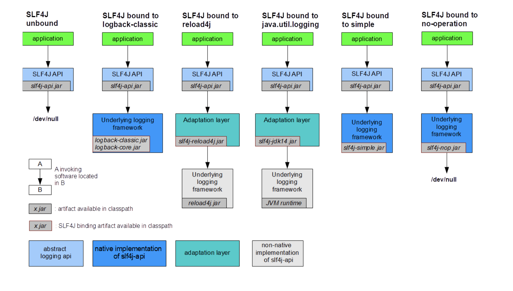 - JVM 클래스 로드 방식을 통해 매우 이른 시기에 프레임워크의 바인딩의 성공 여부를 자동으로 확인할 수 있다. 만약 SLF4J가 클래스 경로에서 바인딩을 찾을 수 없는 경우 단일 경고 메시지를 내보내고 기본적으로 작업 없음 구현으로 설정된다.