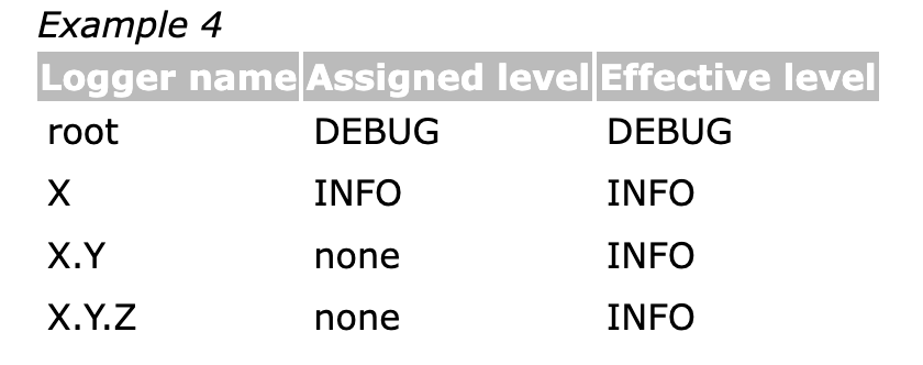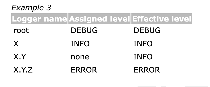 - 만약 주어진 로거에 수준이 할당되지 않는다면 가장 가까운 조상 하나를 상속한다. 예시는 다음과 같다.