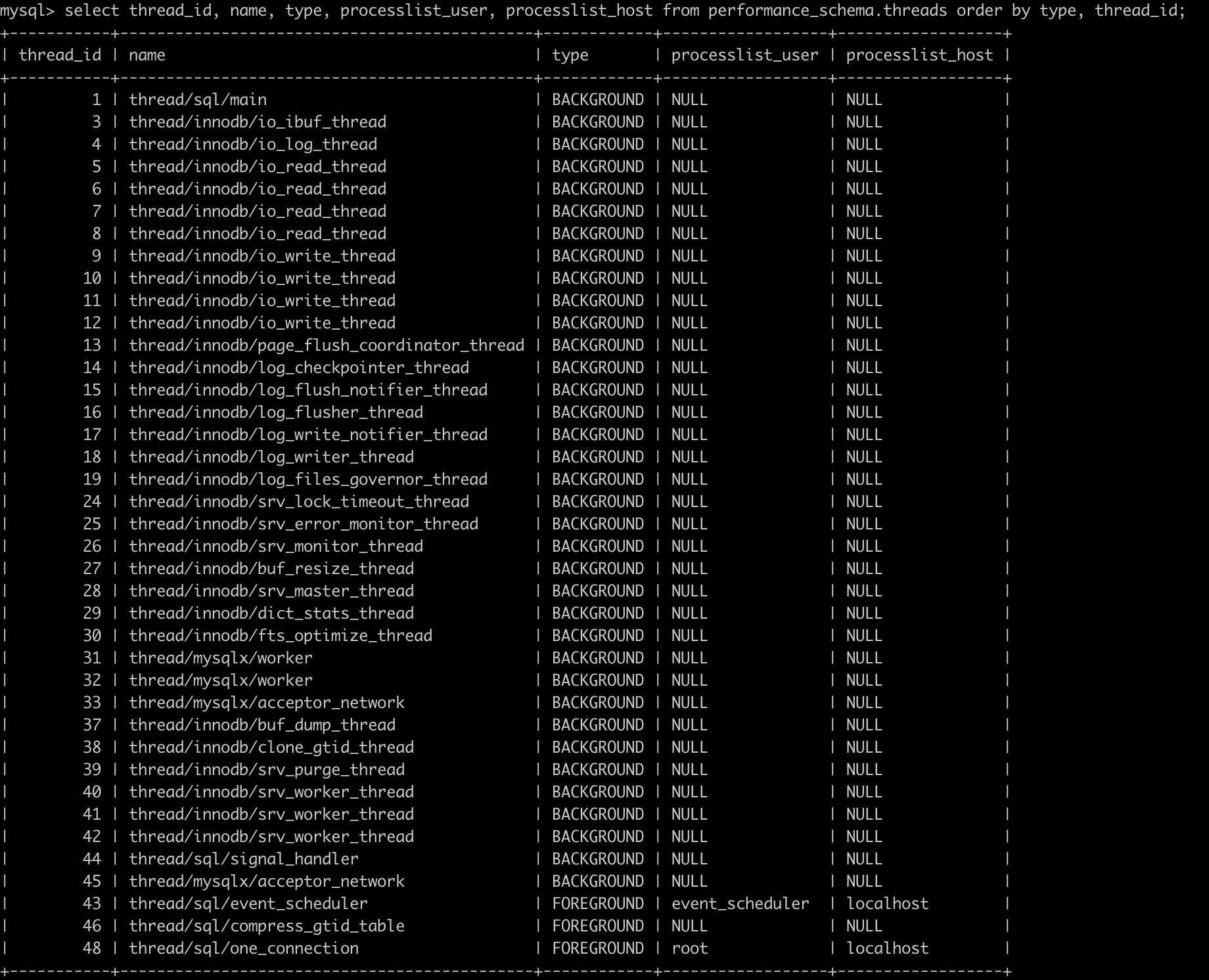 select thread_id, name, type, processlist_user, processlist_host from performance_schema.threads order by type, thread_id;