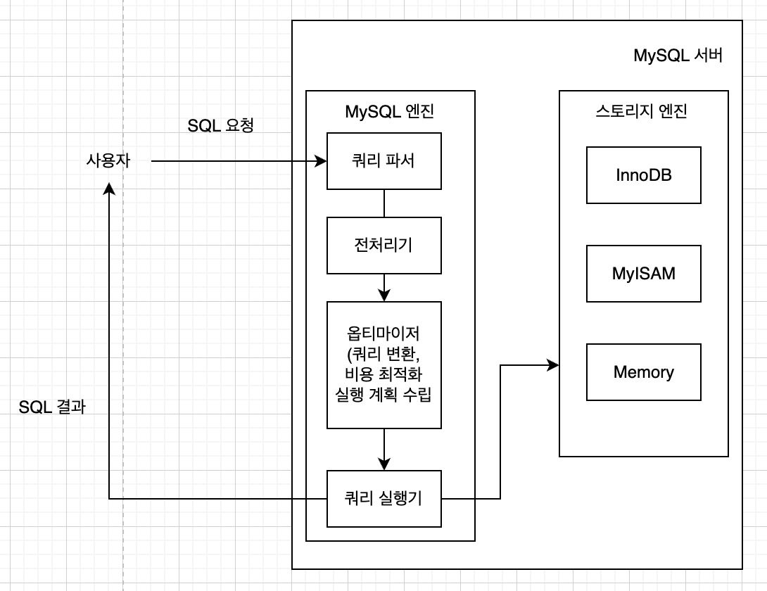 - MySQL엔진은 커넥션 핸들러, SQL 인터페이스, SQL 파서, SQL 옵티마이저, 캐시와 버퍼로 이루어진다.