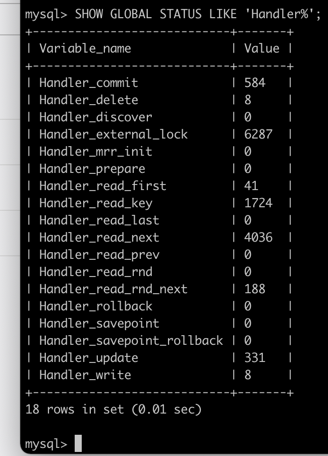 MySQL 상태 변수에는 Handler_로 시작하는 변수들이 많다.