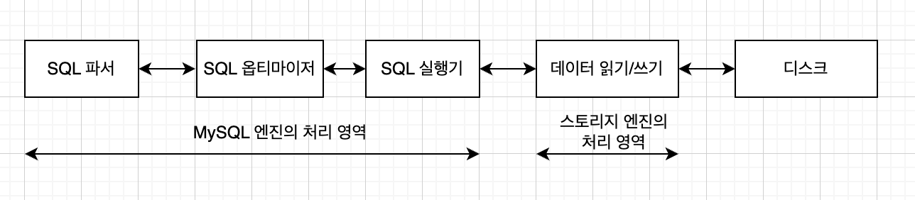 - MySQL 엔진은 요청된 SQL을 분석하거나 최적화하는 등 DBMS의 두뇌에 해당하는 처리를 수행한다.