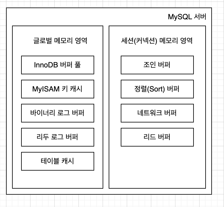 MySQL 메모리 공간은 크게 글로벌 메모리 영역과 로컬 메모리 영역으로 구분할 수 있다.
