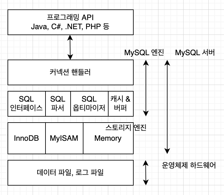- MySQL엔진은 커넥션 핸들러, SQL 인터페이스, SQL 파서, SQL 옵티마이저, 캐시와 버퍼로 이루어진다.