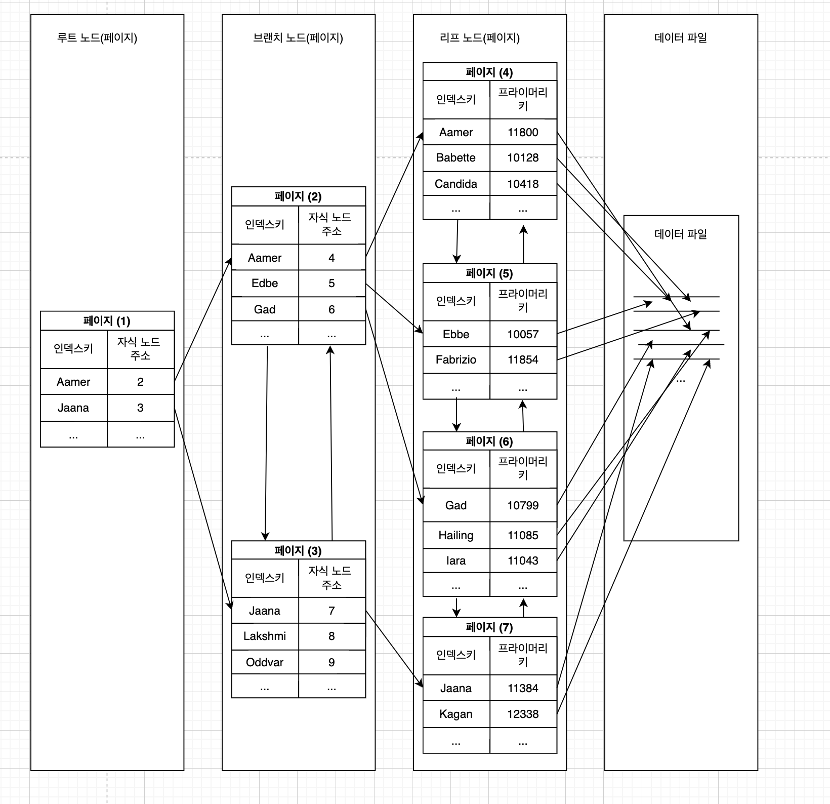 - 위 그림처럼 인덱스의 키 값은 모두 정렬돼 있지만, 데이터 파일의 레코드는 정렬돼 있지 않고 임의의 순서로 저장돼 있다.