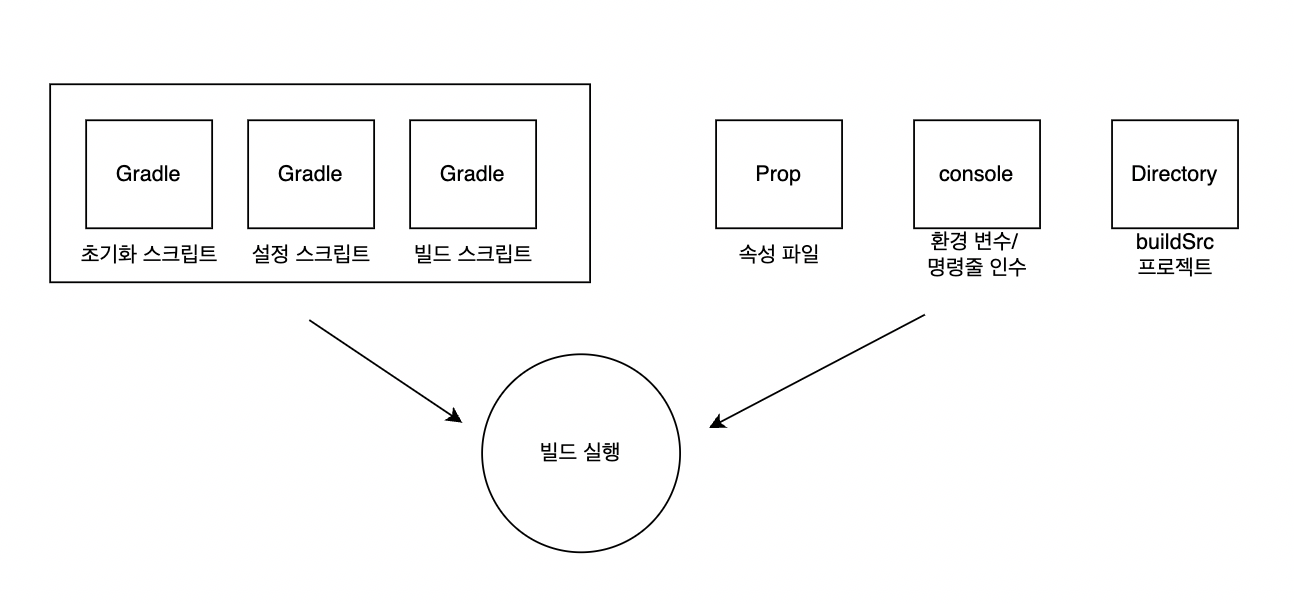 - 그레이들이 설치된 장비의 환경 변수와 빌드 실행 시 명령줄에서 전달하는 인수를 의미한다.