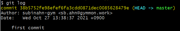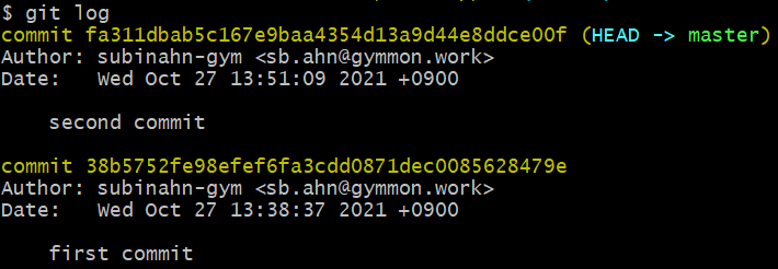 git log 명령어를 이용해 커밋 기록을 확인할 수 있다. log 명령어는 시간 순으로 커밋 기록을 출력한다.