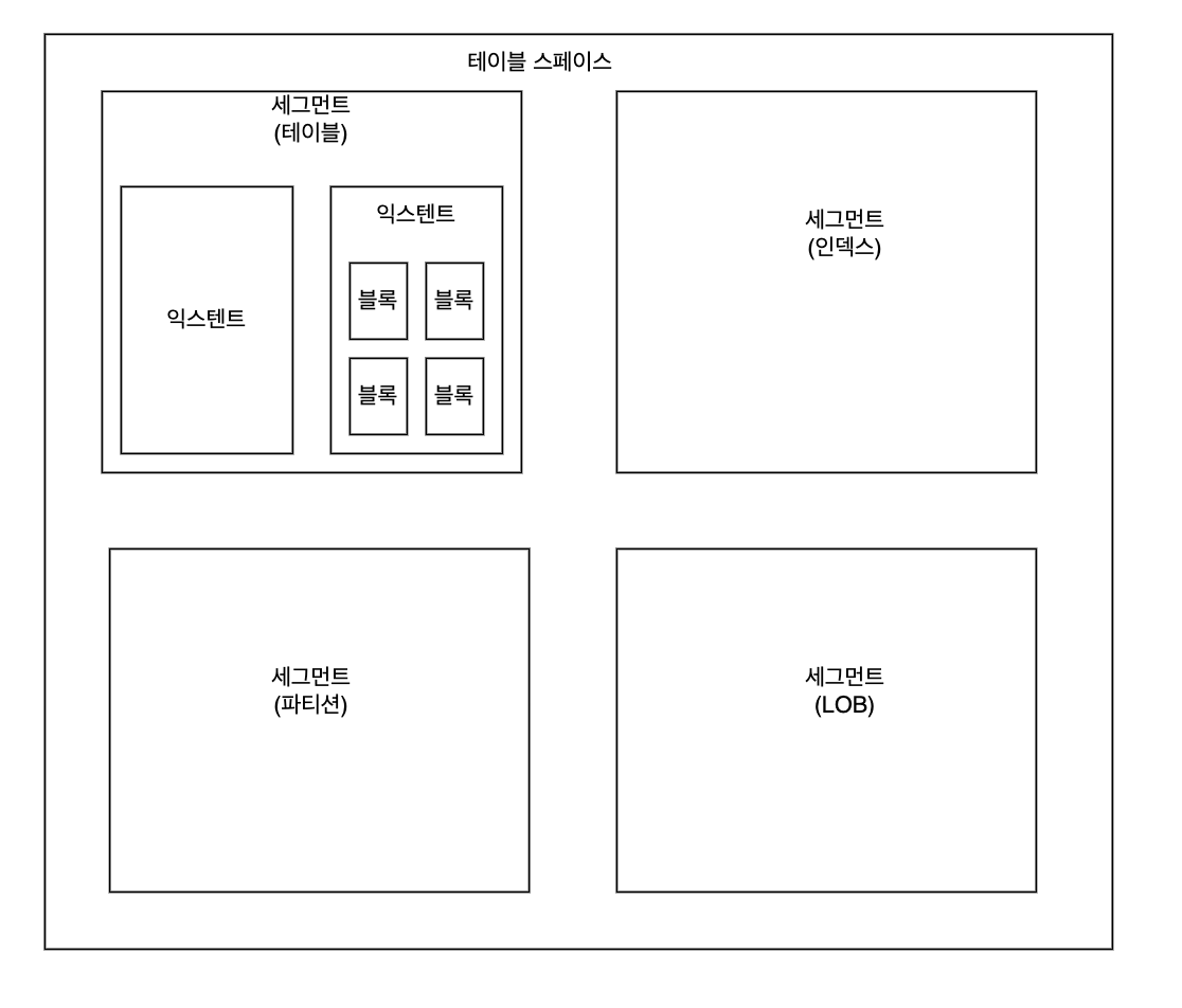 - 테이블 스페이스: 세그먼트를 담는 콘테이너