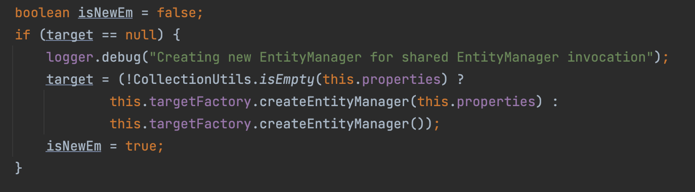 - 현재 트랜잭션 EntityManager에 대한 모든 호출을 위임하고, 그렇지 않은 경우에는 각각의 작업마다 새로운 EntityManager를 생성한다.