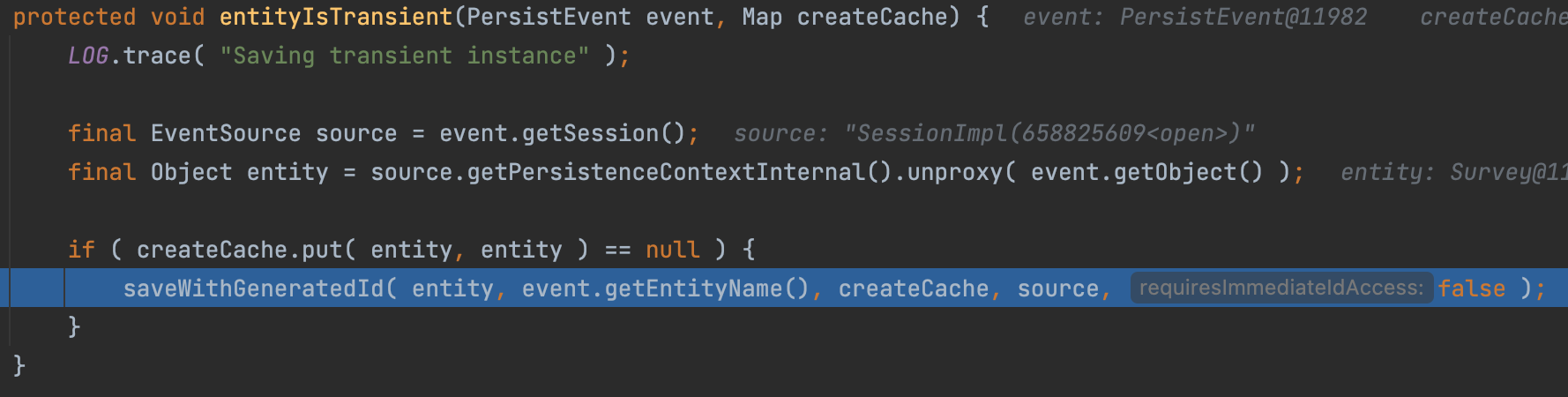 그리고 내부를 더 타고 들어가다보면 영속성 컨텍스트에 엔티티를 저장하는 코드가 나온다.