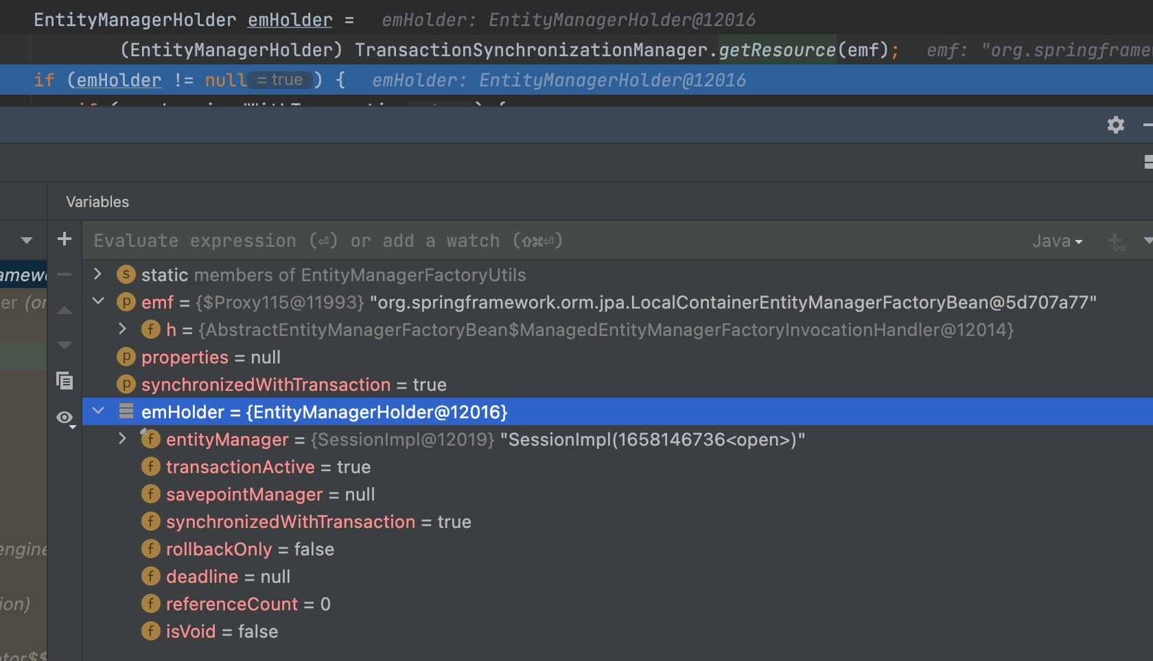 위 코드에서 트랜잭션 동기화 매니저에서 EntityManager를 가지고 있는 EntityManagerHolder 인스턴스를 반환한다.