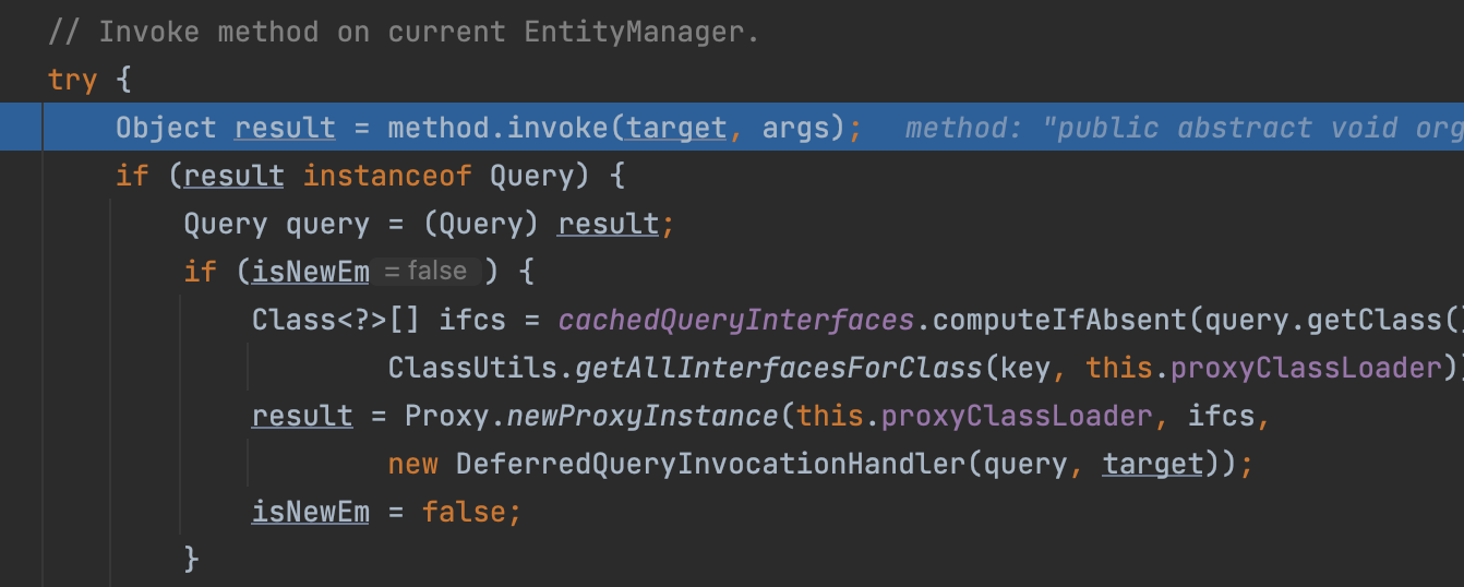 개념을 정리했으니 디버깅을 계속 진행해보자. InvocationHandler의 invoke 메서드를 따라가자.