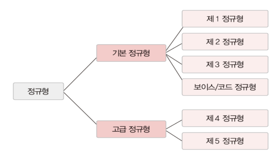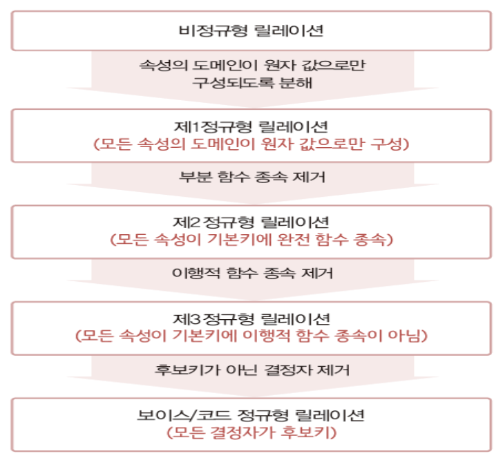 - 릴레이션이 정규화된 정도. 각 정규형마다 제약조건이 존재.