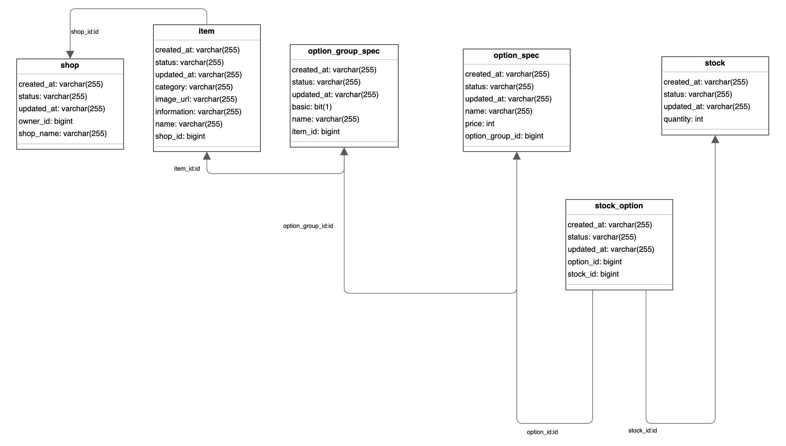 따라서 재고와 상품 옵션이 M:N 관계이다. M:N 관계이므로 중간 테이블을 두어 테이블을 설계했다.