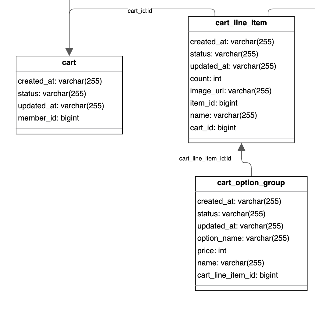 - 장바구니 상품과 담긴 상품의 옵션 그룹은 1:N이다. 담긴 상품에는 색깔, 사이즈 같이 많은 옵션 그룹이 존재할 수 있다.