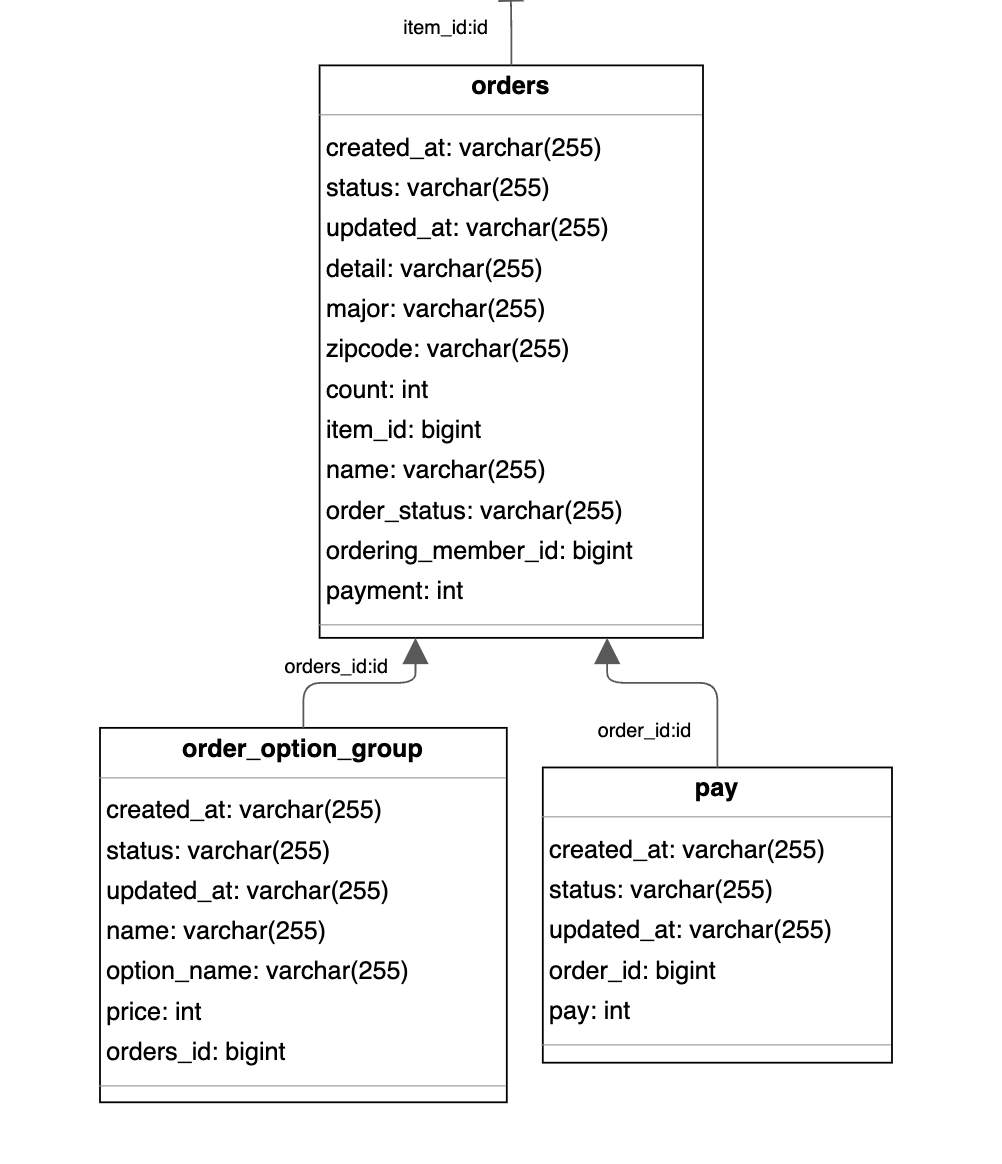즉 하나의 주문은 1개의 상품만 주문할 수 있다. - 주문과 주문 옵션은 1:N 관계다. 장바구니와 비슷하게 주문 옵션은 1개만 골라야하므로 주문 옵션 그룹 테이블에 주문 옵션을 포함했다.