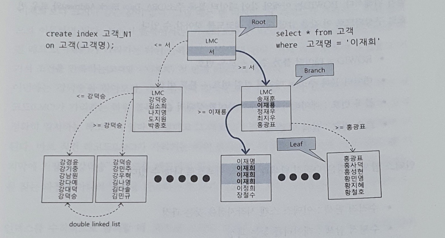 - 인덱스 리프 블록끼리는 서로 앞뒤 블록에 대한 주솟값을 가지는, 양방향 연결리스트라서 수평적 탐색이 가능하다.