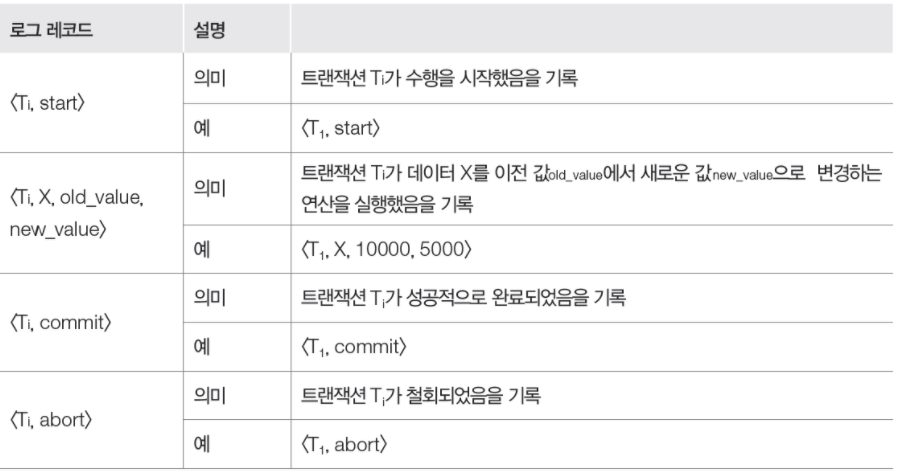 - 장애 발생에 대비하기 위해 데이터 변경에 대한 내용을 로그 파일에 기록 (데이터 변경 연산이 실행되면, 로그 파일에 로그 레코드를 먼저 기록한 다음 데이터베이스에 변경 연산을 반영)