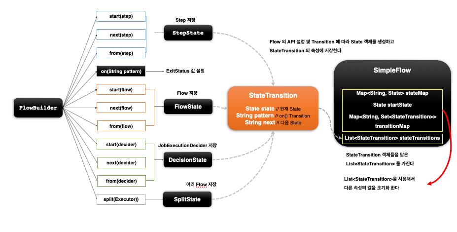 - FlowBuilder를 사용해서 생성하여 Transition과 조합하여 여러 개의 Flow 및 중첩 Flow를 만들어 Job을 구성할 수 있다.