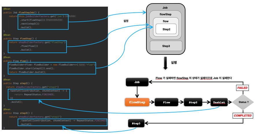 - flowStep의 BatchStatus와 ExitStatus은 Flow의 최종 상태값에 따라 결정된다.