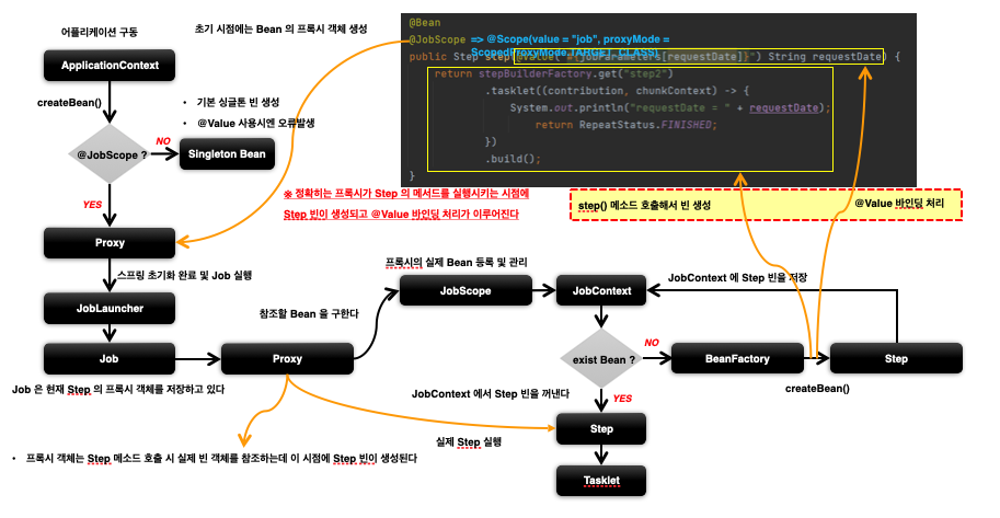 - @JobScope, @StepScope 애노테이션이 붙은 빈 선언은 내부적으로 빈의 Proxy 객체가 생성된다.