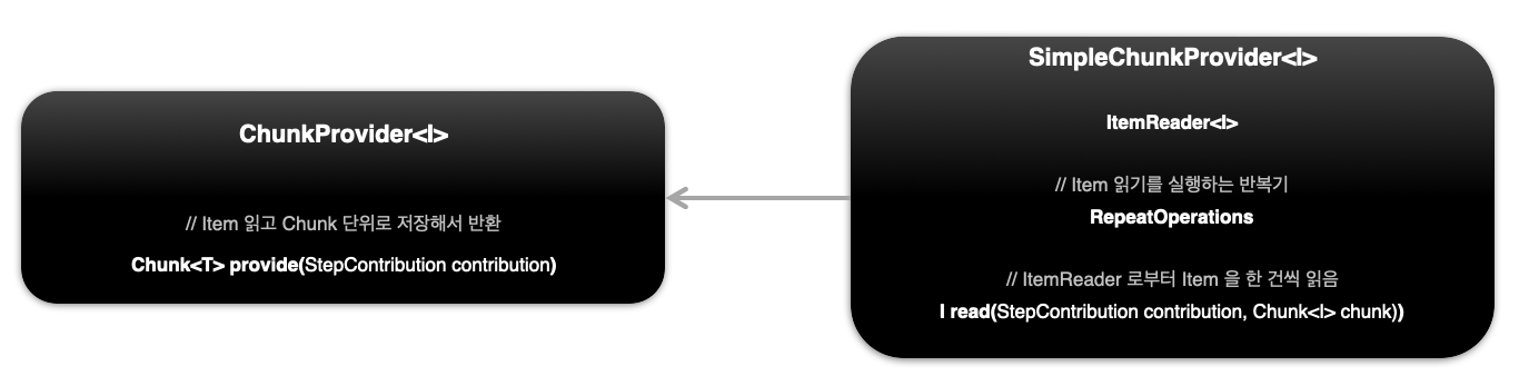 - 내부적으로 ItemReader를 핸들링하는 ChunkProvider와 ItemProcessor, ItemWriter를 핸들링하는 ChunkProcessor 타입의 구현체를 가진다.