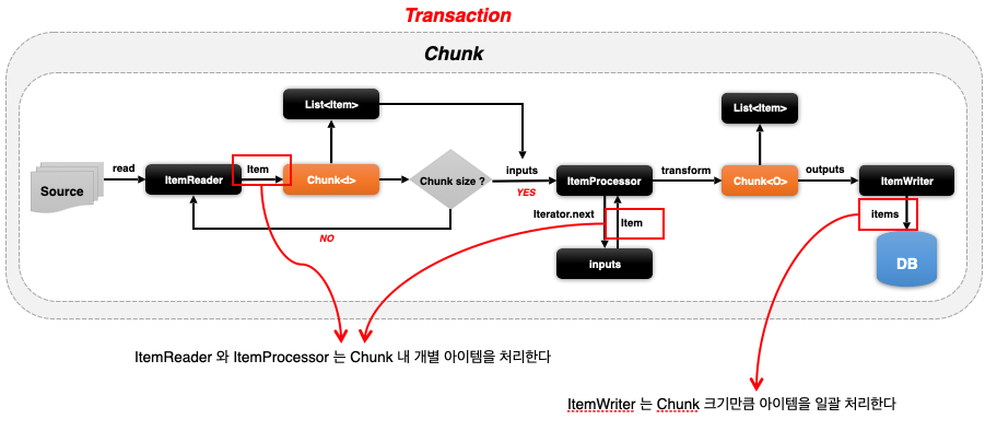 - 한번에 하나씩 아이템을 입력 받아 Chunk 단위의 덩어리로 만든 후 Chunk 단위로 트랜잭션을 처리함, 즉 Chunk 단위의 Commit과 Rollback이 이루어짐