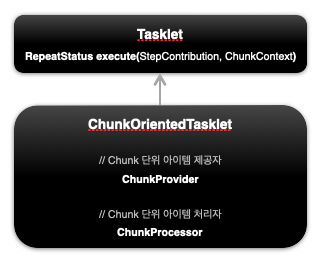 - ChunkOrientedTasklet은 스프링 배치에서 제공하는 Tasklet의 구현체로서 Chunk 지향 프로세싱을 담당하는 도메인 객체