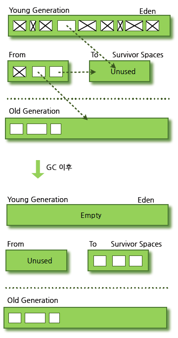 - 하나의 Survivor 영역이 가득 차게 되면 그중에서 살아남은 객체를 다른 Survivor 영역으로 이동한다. 그리고 가득 찬 Survivor 영역은 아무 데이터도 없는 상태로 된다.