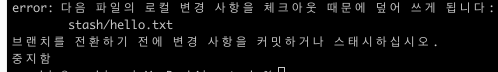 현재 워킹 디렉토리의 작업이 다른 브랜치의 워킹 디렉터리에 영향을 줄 수 있으므로 아래와 같은 메시지가 나온다.