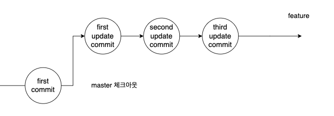 그럼 master와 feature 브랜치는 시작점은 동일하지만 feature 브랜치가 커밋이 3개 앞선다.