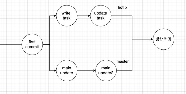 - 브랜치가 분기되면 전체 커밋 그림으로 보면 모든 변경사항이 순차적