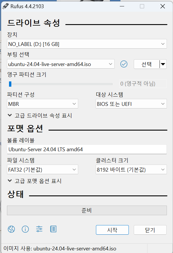 Rufus를 실행해서 ubuntu를 굽는다(?)