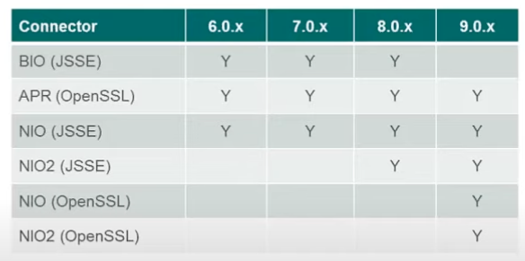 아래 표를 참고하면 커넥터에서 JSSE와 OpenSSL을 지원하는 Tomcat 버전을 확인할 수 있다.