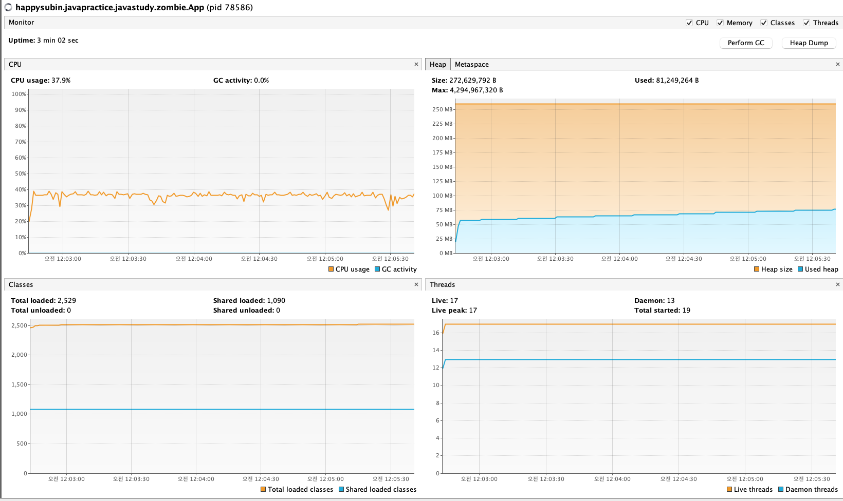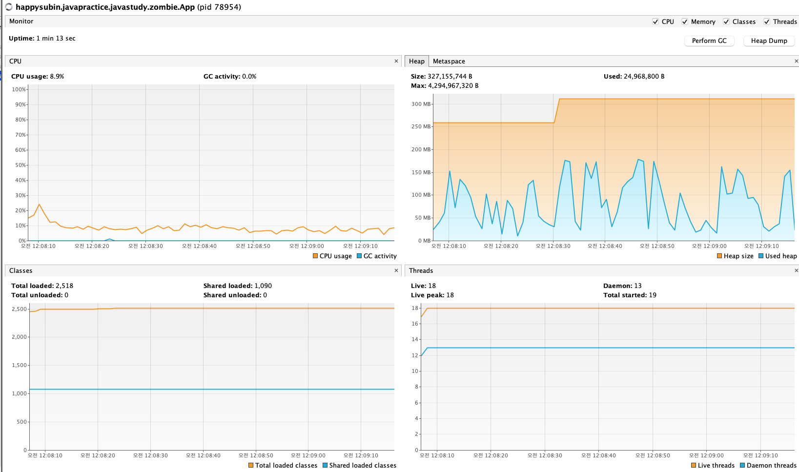 GC가 전체 CPU 사용량에서 차지하는 비중이 없다는 부분은 매우 흥미롭다.