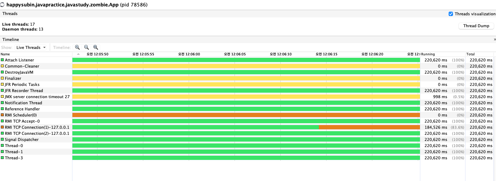 - 실행 중인 스레드를 시각화하여 조사한다.