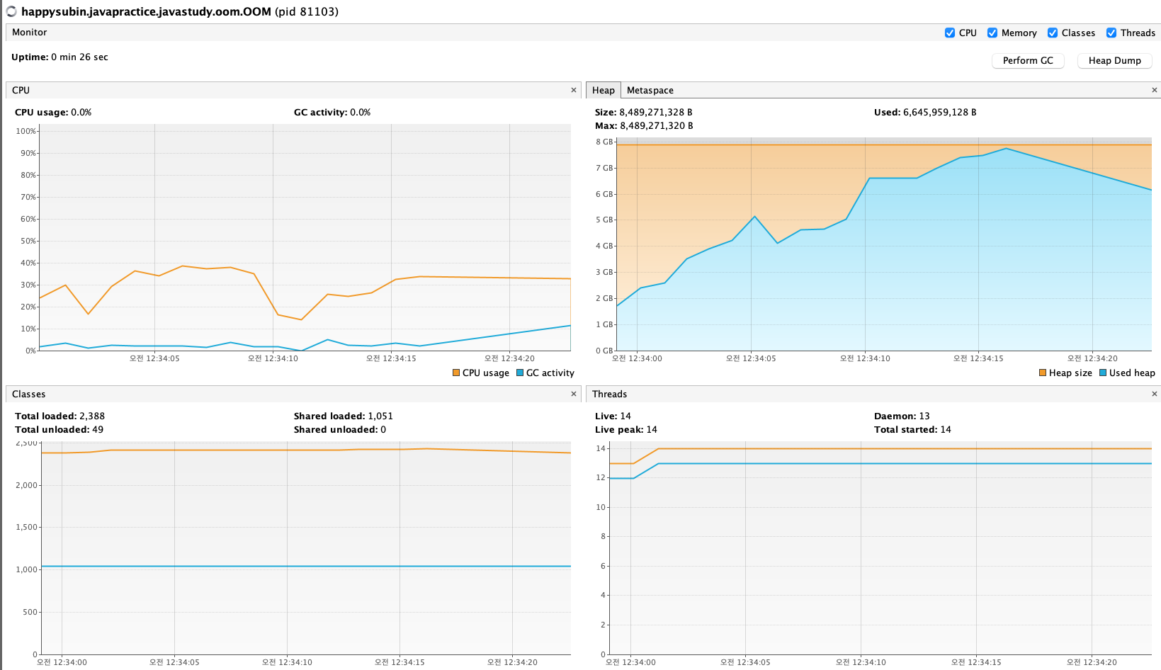 접속하면 왼쪽에 메인 프로세스가 표시되는데, 우리가 프로세스를 명명하지 않아 메인 클래스명으로 표시된다.