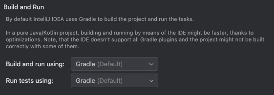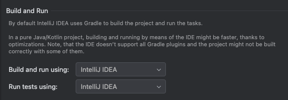 우선 인텔리제이에서 Build And Run 설정을 IntelliJ IDEA로 설정했다.