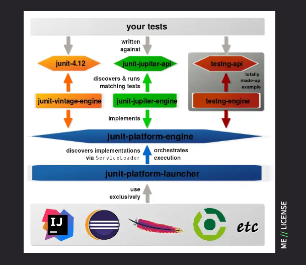 - 테스트를 발견하고 계획을 생성하는 TestEngine API를 포함하며, 해당 API를 사용하면 IDE(예: IntelliJ, Eclipse), 빌드 도구(예: Gradle, Maven)에서 JUnit 테스트 실행 가능
