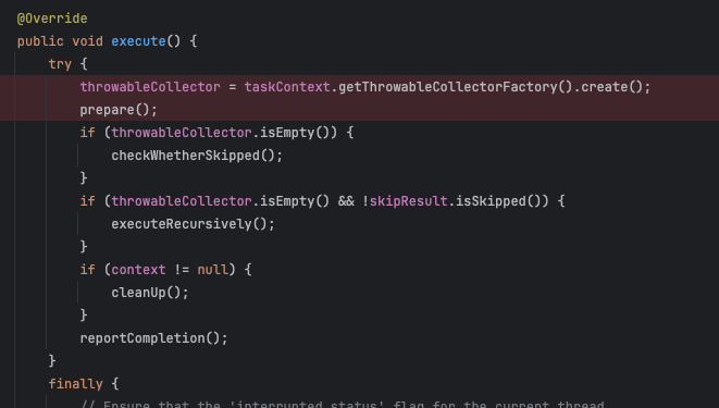 메서드 내부에서 ThrowableCollector라는 클래스가 있는데, 예외가 터지면 인스턴스 변수 throwable에 Throwable 타입의 객체를 담는다.