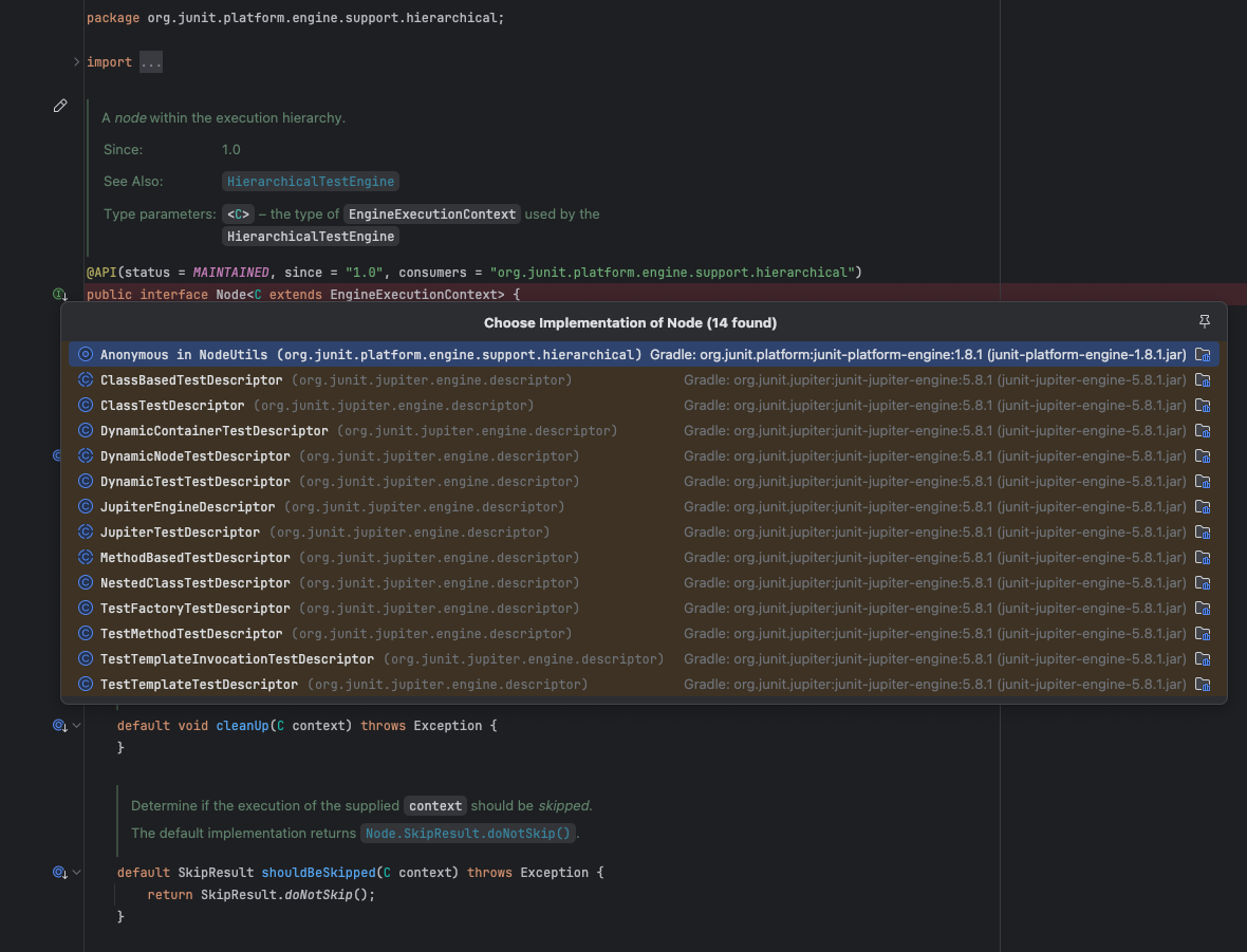- junit-platform-launcher: ServiceLoader를 사용하여 테스트 엔진 구현체를 발견하고 실행을 조율한다. IDE와 빌드 도구에 API를 제공하여 개별 테스트를 실행하고 결과를 표시하는 등의 테스트 실행과 상호 작용할 수 있게 한다.