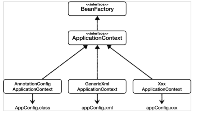 이 ApplicationContext 인터페이스를 상속받는 게 AnnotationConfigApplicationContext다. 이 세 가지는 모두 스프링 컨테이너다.