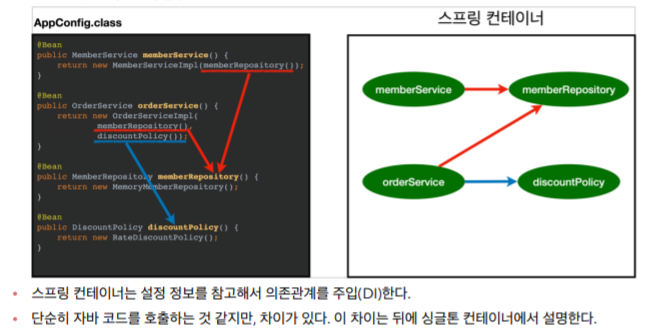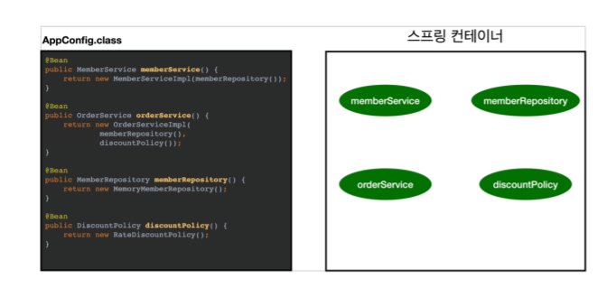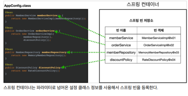 - 스프링 컨테이너는 @Configuration이 붙은 AppConfig를 설정 정보로 사용한다. @Bean이라 적힌 메서드를 모두 호출해서 반환된 객체를 스프링 컨테이너에 등록한다. 이렇게 스프링 컨테이너에 등록된 객체를 스프링 빈이라고 한다. 스프링 빈은 보통 메서드의 명을 스프링 빈 이름으로 사용한다.