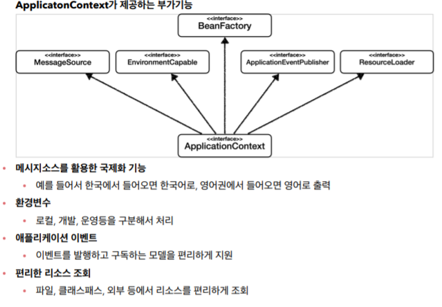 Application Context는 BeanFactory의 기능을 모두 상속받아 제공하며, 더 많은 부가적인 기능을 제공한다.