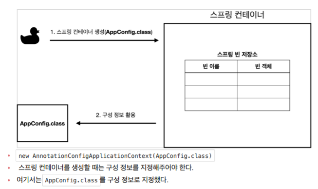 - 기존에는 개발자가 AppConfig를 사용해서 직접 객체를 생성하고 Di 했지만, 이제부터는 스프링 컨테이너를 이용해 등록한다.