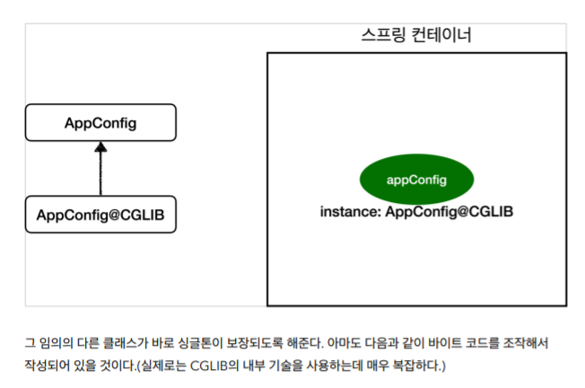 즉 AppConfig@CGLIM는 @Bean이 붙은 메서드마다 이미 스프링 빈이 존재하면 존재하는 빈을 반환하고, 스프링 빈이 없으면 생성해서 스프링 빈으로 등록하고 반환하는 코드가 동적으로 만들어진다. 덕분에 싱글톤이 보장되는 것이다.