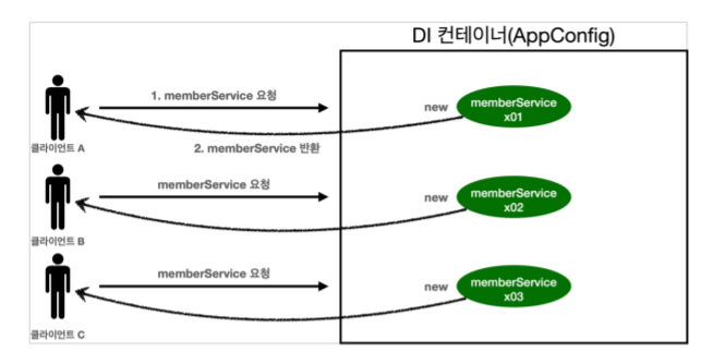 - 스프링 컨테이너는 싱글턴 패턴을 적용하지 않아도, 객체 인스턴스를 싱글톤으로 관리한다. 컨테이너는 객체를 하나만 생성해서 관리한다.