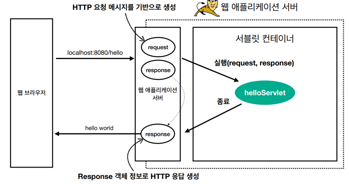- WAS는 Request, Response 객체를 새로 만들어서 서블릿 객체를 호출한다.