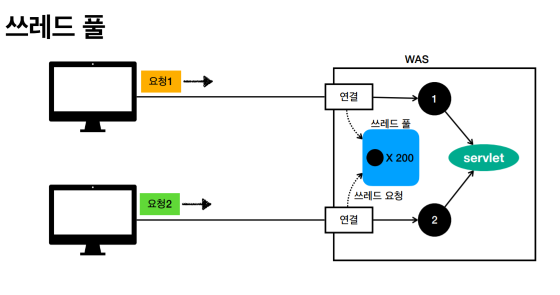 필요한 스레드를 스레드 풀에 보관하고 관리한다. 스레드 풀에 생성 가능한 스레드의 최대치를 관리한다. 톰캣은 최대 200개가 기본 설정이다. 당연히 변경 가능하다.